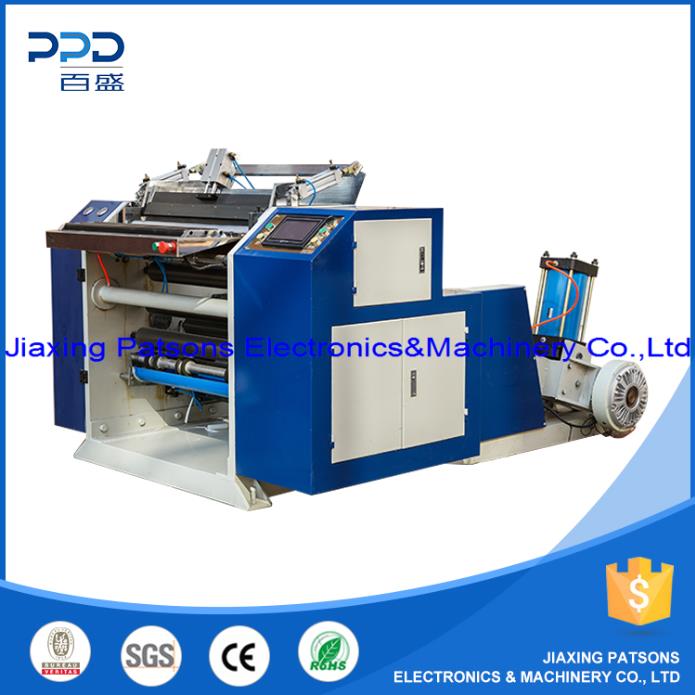 It is automatic jumbo roll loading,automatic paper feeding for rewinding,automatic stop when reach length setting.